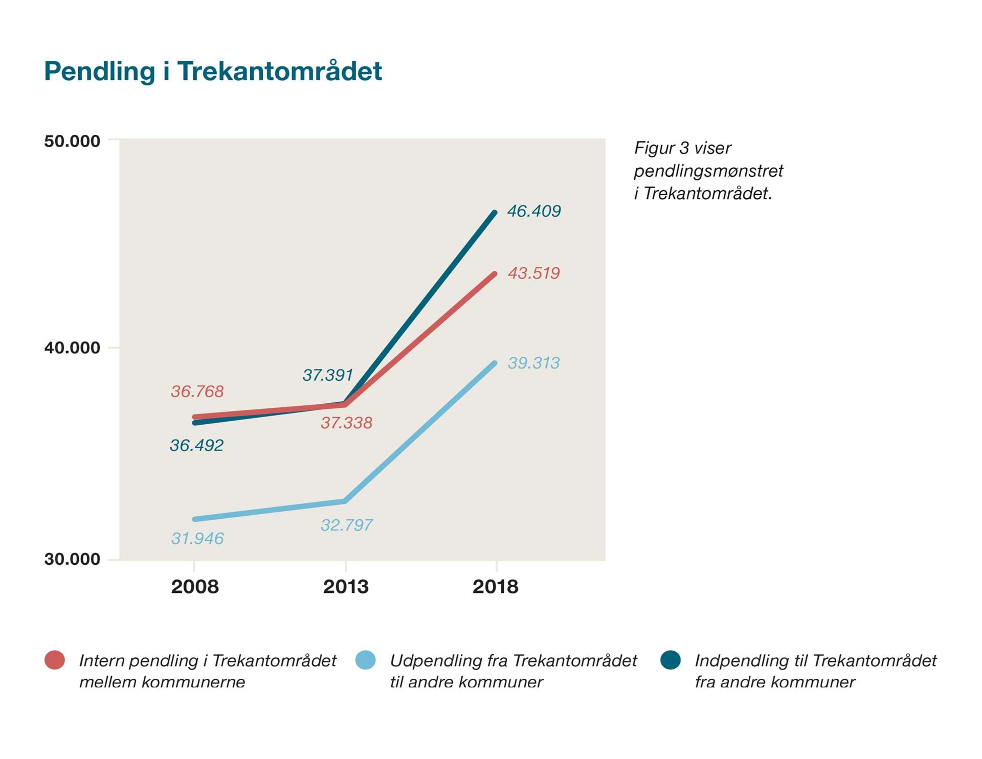 Grafen nedenfor viser, at pendlingen er stadigt stigende i Trekantområdet, og det uanset om der er tale om intern pendling mellem kommunerne i Trekantområdet eller ind- og udpendling til/fra Trekantområdet.