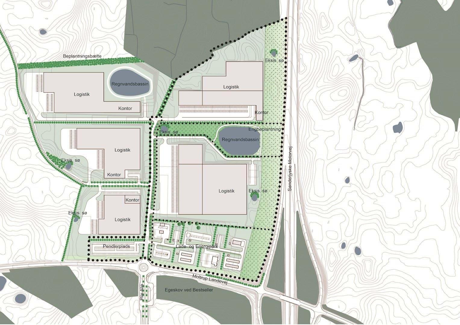 Kommuneplantillægget fastlægger områdets anvendelse til erhvervsområde forbeholdt til transport- og logistikvirksomheder samt andre transporttunge virksomheder med mulighed for udbygning over 2 etaper. I etape 1 - området nærmest motorvejen - vil et område på ca. 4 ha grænsende op til Moltrup Landevej og den vestlige motorvejsrampe blive forbeholdt servicefaciliteter i form af restauranter, tankstationer med tilhørende kiosk, vaskehaller, ladestandere og lignende. Endvidere forbeholdes et område på 1 ha i umiddelbar forlængelse af ovennævnte område til samkørselsplads.
