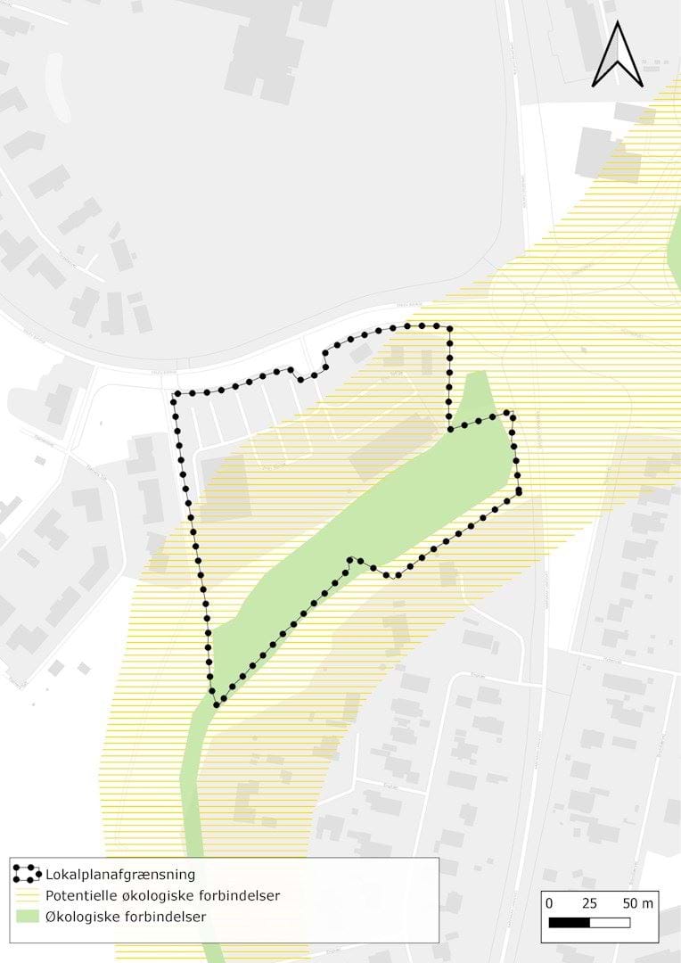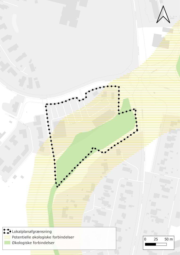 Lokalplanområdet ligger i et område med både økologiske forbindelser og potentielle økologiske forbindelser, jf. figur 3. Af kommuneplanens retningslinje 3.4.1. fremgår blandt andet, at de økologiske forbindelser og de potentielle økologiske forbindelser skal medvirke til at styrke byernes rekreative og naturlige miljøer samt indgå og friholdes som rekreative forbindelser mod det omkringliggende åbne land.
